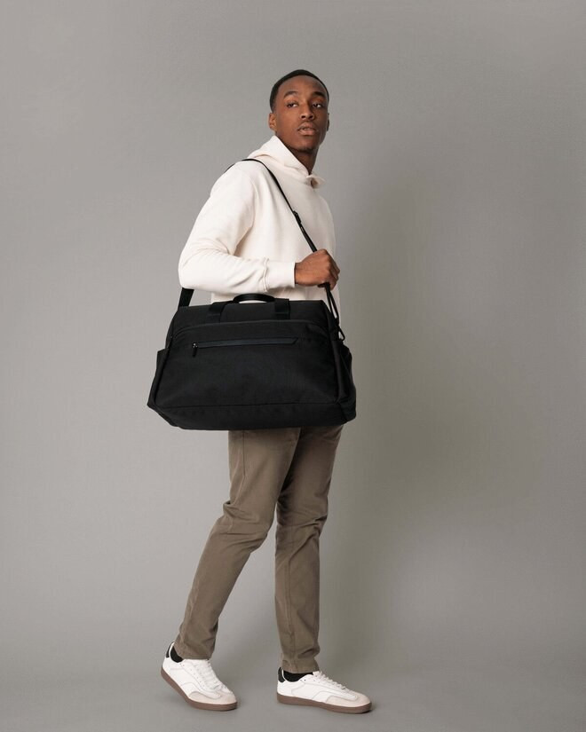 Rear zippered pocket doubles as a sleeve to slide over suitcase handle