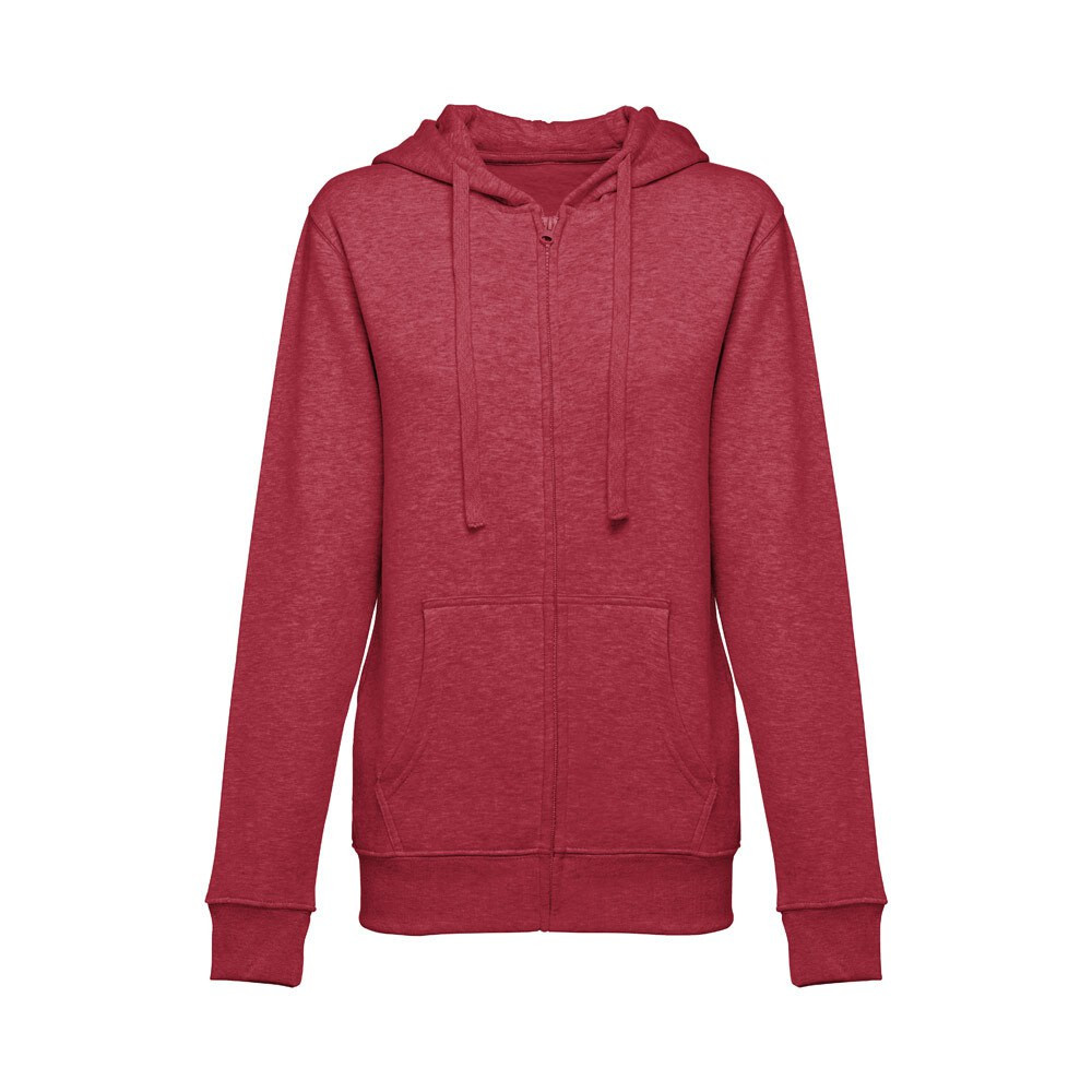 50% cotton and 50% polyester women's sweatshirt (320 g/m²) with carded interior. The hood is lined and contains colour cord closure. The front area has two marsupial pockets with plastic cover closure. Piece with cuffs and ribbon waistband