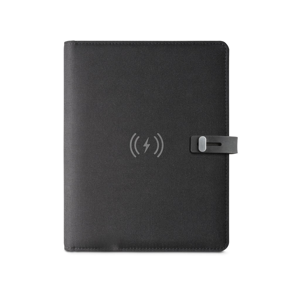 A5 folder in 300D recycled polyester (100% rPET) with wireless charger