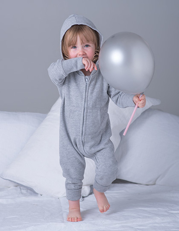 Brushed back fleece. Single layer hood. Zip front with chin guard. Seam free back. Two front pockets. Extra long cuffed sleeves and leg openings. Tear out label.