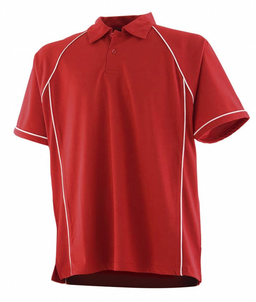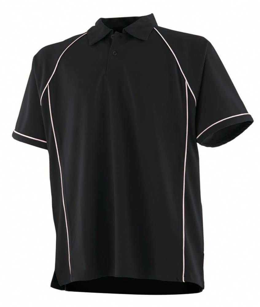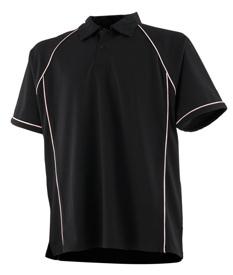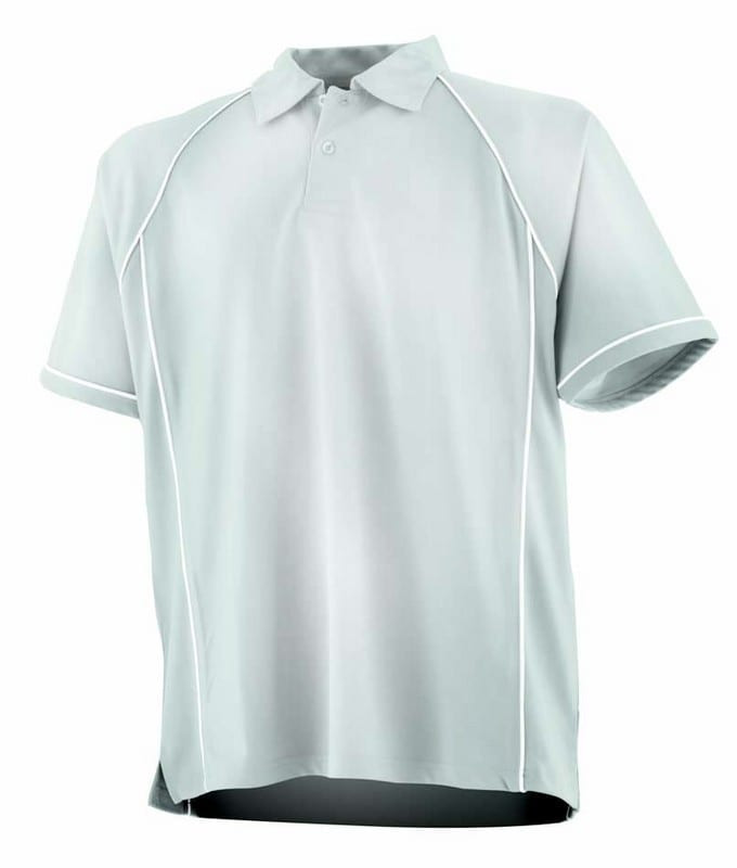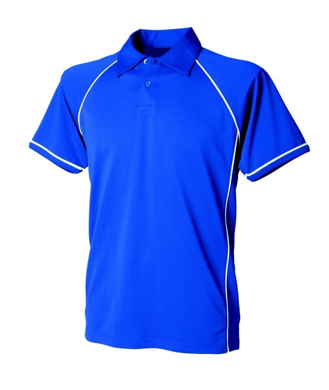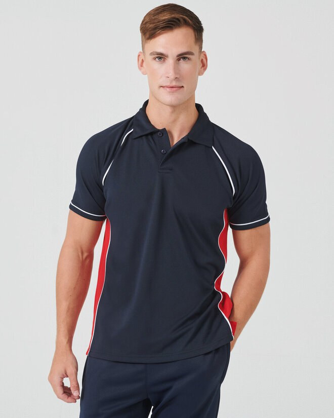 100% polyester. Coolplus® modified polyester fibre draws moisture away from skin to keep you cool and dry. Self fabric collar. Two self colour button placket. Piping along raglan seams and at body sides and cuffs. Side vents. Twin needle hem.