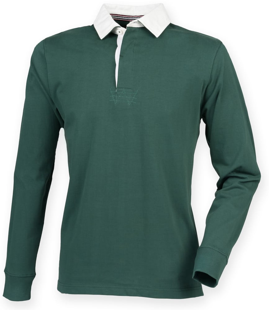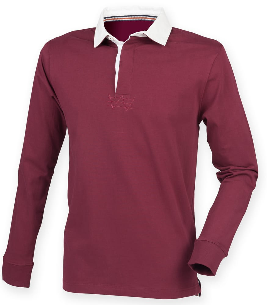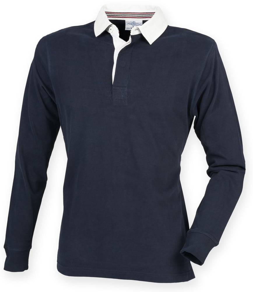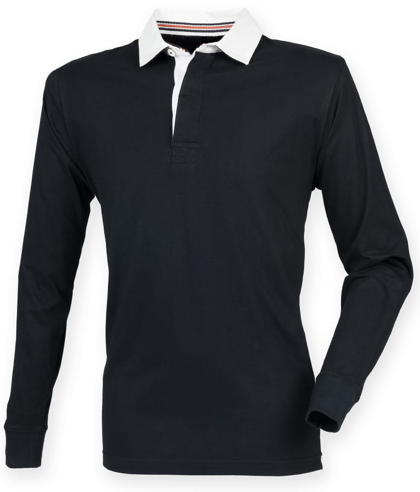 100% cotton. Traditional slim fit rugby with cotton webbing collar. Super soft peached finish. Contrast trim in back neck. Self colour buttons. Ribbed cuffs. Side vents with contrast tape detail. Twin needle hem. Tag free. For leisure use only.
