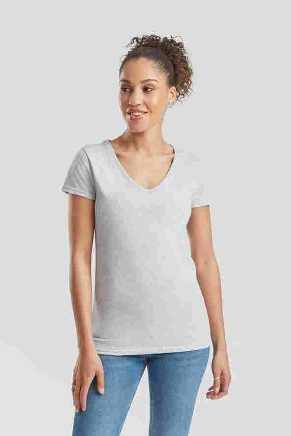 A V-Neck T-Shirt For Ladies Using The Best-Selling Fruit Of The Loom Valueweight Fabric. With Shaped Side Seams & A Wide Opening V-Neck Design This Has A Flattering, Fitted Silhouette.