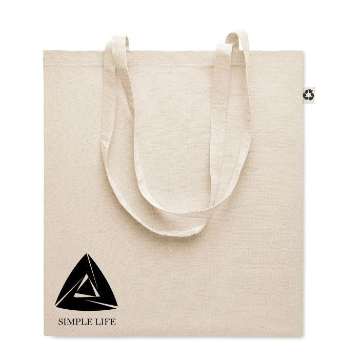 This shopping bag is made of 140 g/m² post-consumer recycled cotton (65% recycled cotton, 35% cotton).