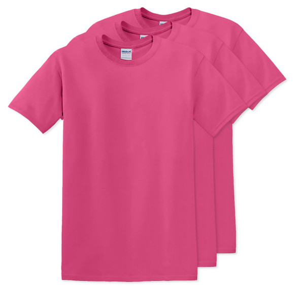 -Sunset, Safety Pink, Russet, Neon (Green, Blue), Midnight, Lilac, Blackberry, Tweed, Safety Green, S. Orange, Dark Heather, Graphite Heather, and Heather (Military Green, Radiant Orchid, Red, Sapphire) are 50% cotton, 50% polyester