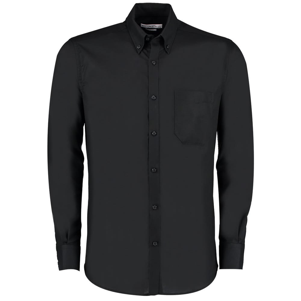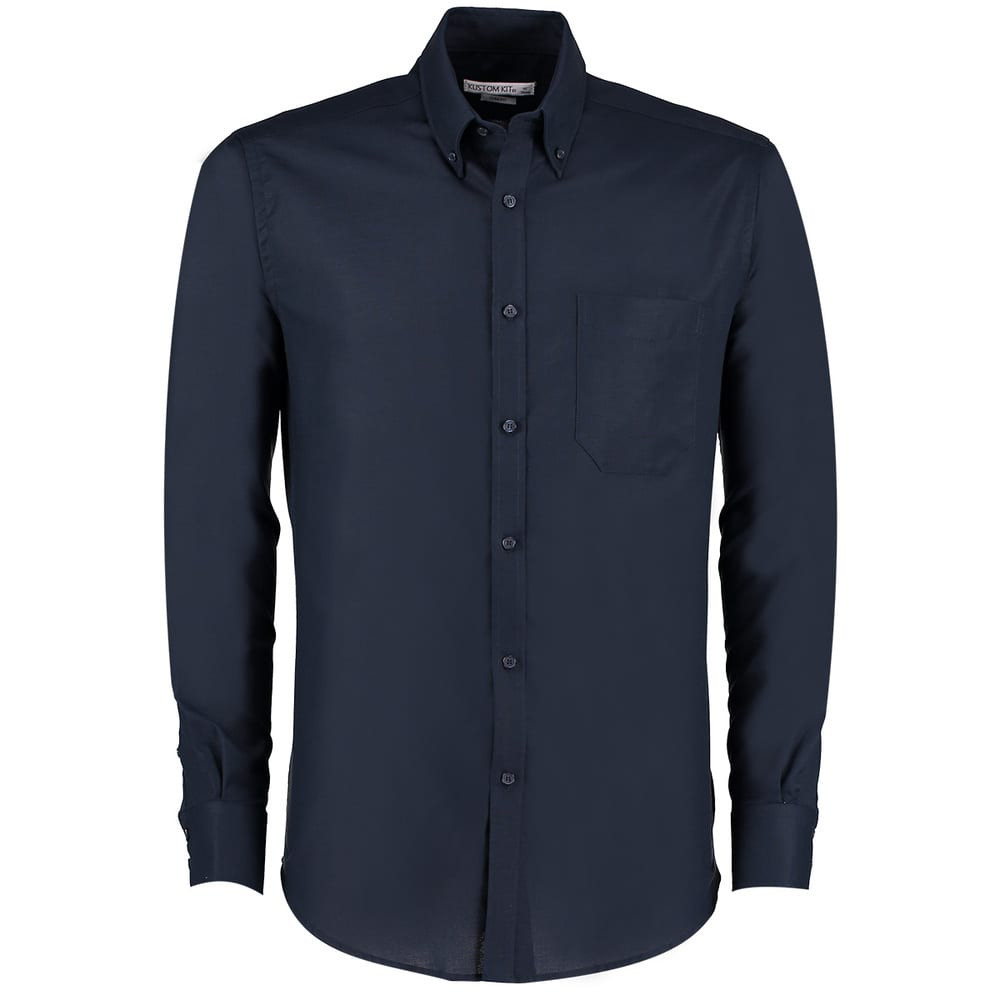 Fused stand up collar. Button down collar. Double button cuffs with gamble placket. Double folded side and side seams (double stitched). Chest pocket to left side as worn. Single stitched yoke and armholes. Shirt tail hem. Darted back panel. Spare button. Kustom Kit®Woven label. 50° Wash Washing Instructions Machine wash 50 with bar under do not bleech , do not dry clean, do not tumble dry , two dot iron