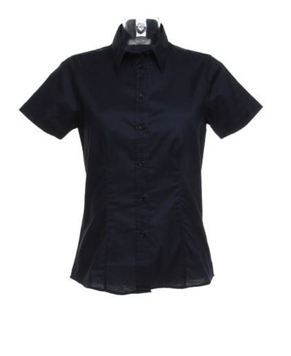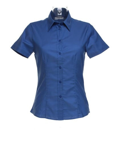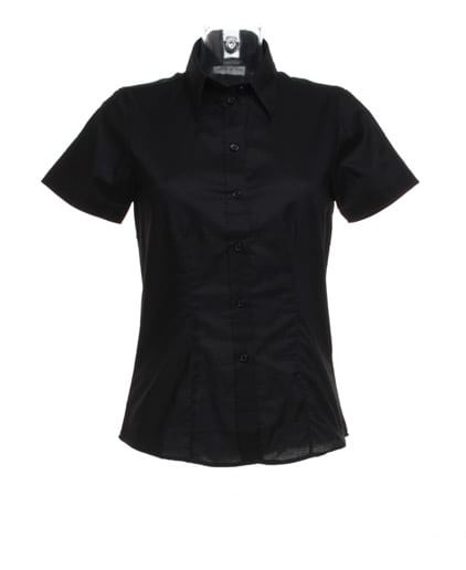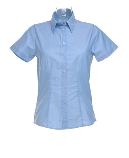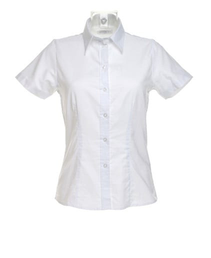 Fused collar. Semi fitted, back yoke. Rounded bottom. Front and back darts. Spare button.