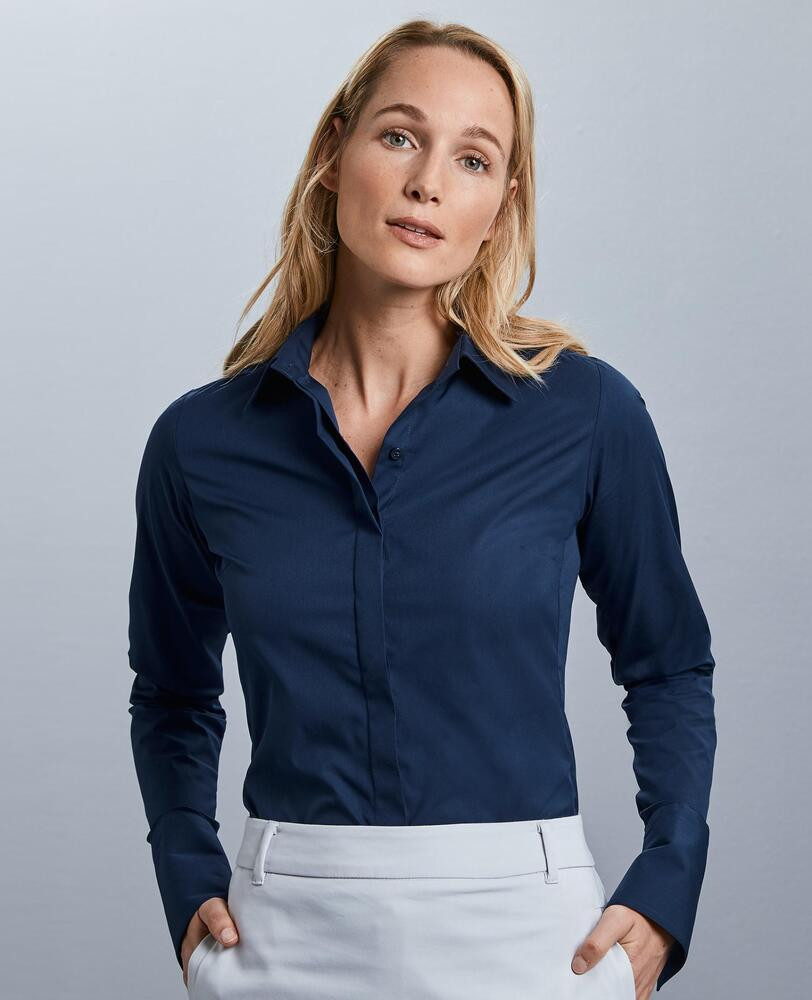 Smart, Elegant Business Shirts With High-Performance Fabric & Pristine Styling Details. Moisture Management Provides Cool Comfort & The Revolutionary Elastomultiester Lycra T400 Fibre Provides Gentle Stretch In All Directions For A Perfect Fit All Day Long. The Feminine Shape, Concealed Modesty Placket, Cocktail Cuffs & Neat Modern Collar Add Contemporary Styling Details.