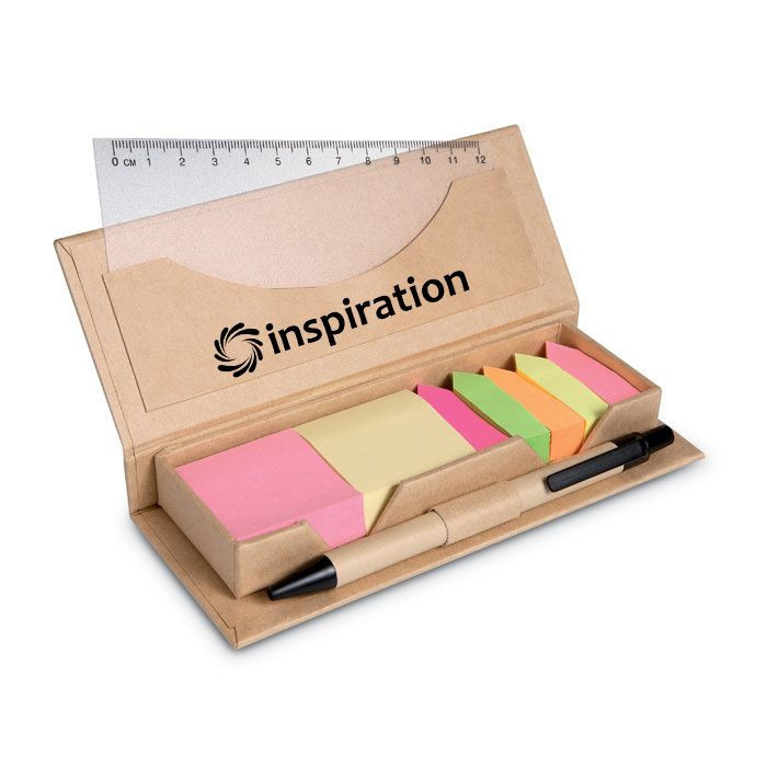 Recycled cardboard sticky memo note dispencer with matching pen.