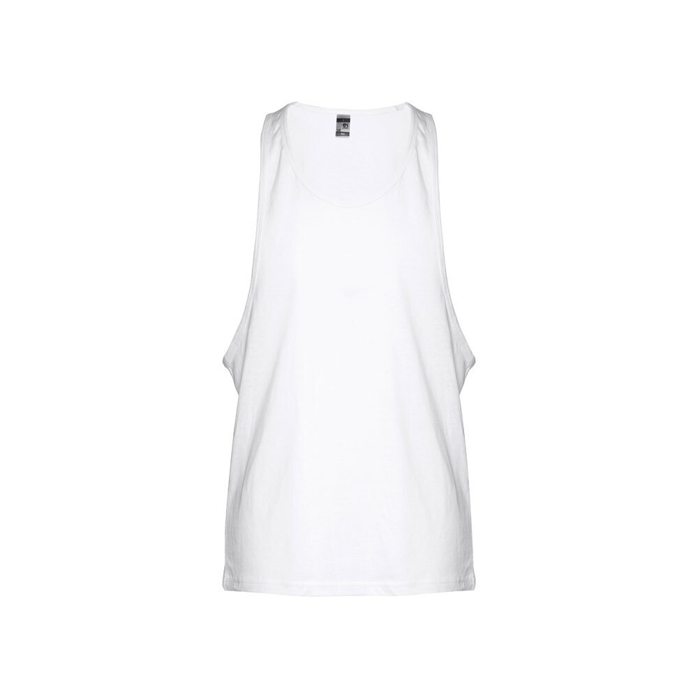 100% cotton men's sleeveless jersey (140 g/m²) with carded cotton yarn. Wide armholes and round collar, with bias tape on the armholes and neckline. Piece cut and sewn with double seam at the hemline