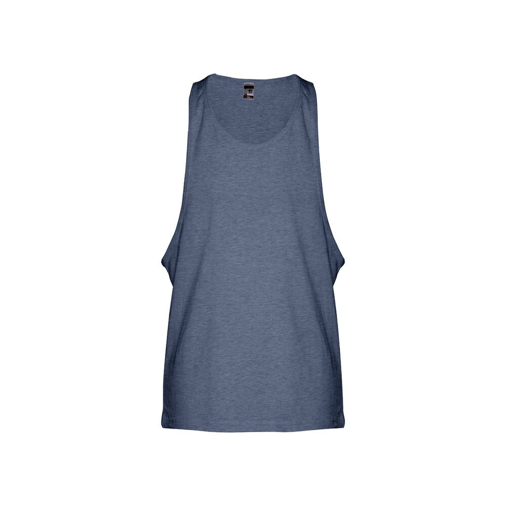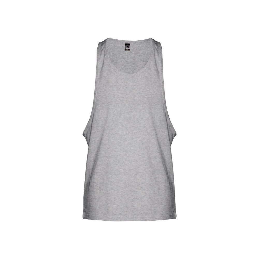 100% cotton men's sleeveless jersey (140 g/m²) with carded cotton yarn (colours: 194, 195 and 199: 60% cotton/40% polyester and colour 183: 90% cotton/10% viscose). Wide armholes and round collar, with bias tape on the armholes and neckline. Piece cut and sewn with double seam at the hemline