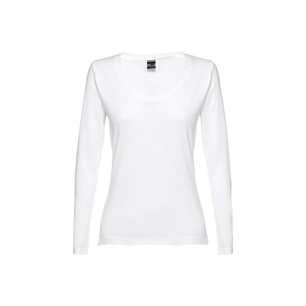 Long-sleeved fitted women's jersey t-shirt 100% cotton (150 g/m²) with carded cotton yarn. Modern cut with collar with jersey reinforcement ribbon. Cut and sewn piece with double seam on the sleeves and hemline