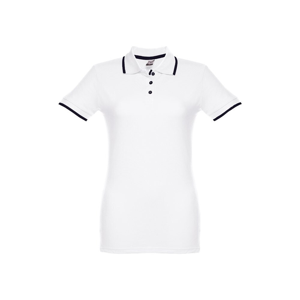 Short-sleeved bicolour polo for women in 100% carded cotton pique (210 g/m²). Two-colour contrast on the collar, sleeve and placket. Features a collar and cuffs in Rib. Reinforced placket with 3 contrasting colour buttons (extra button inserted in the inner side seam). Fitted waist and small side vents at the hemline of the polo. Sizes: S, M, L, XL, XXL