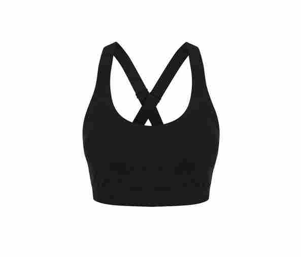 Crew neck with crossover straps at the back.