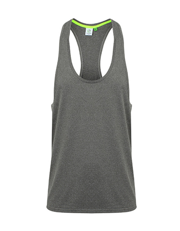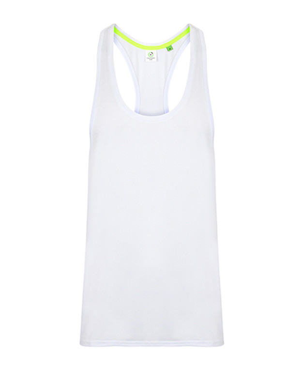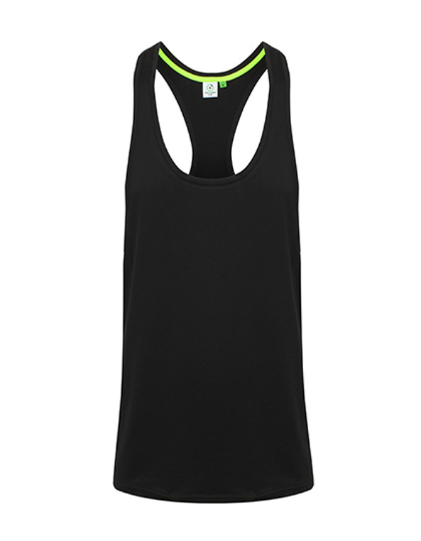 Lightweight. Self fabric bound neck and armholes. Twin needle hem. Tear out label.
